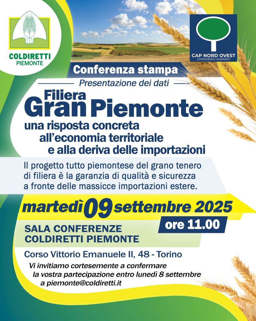 L’appuntamento per evidenziare la situazione ormai incontrollata delle importazioni e per valorizzare, ulteriormente, il grano made in Piemonte è per martedì 9 settembre 2025 alle ore 11:00 presso la sala conferenze di Coldiretti Piemonte, in corso Vittorio Emanuele II, 48 a Torino dove interverranno il membro di giunta di Coldiretti Piemonte con delega al settore cerealicolo, Mauro Bianco ed il presidente del Consorzio Agrario del Nord Ovest, Adriano Cavallito, con i tecnici e gli esperti del settore.