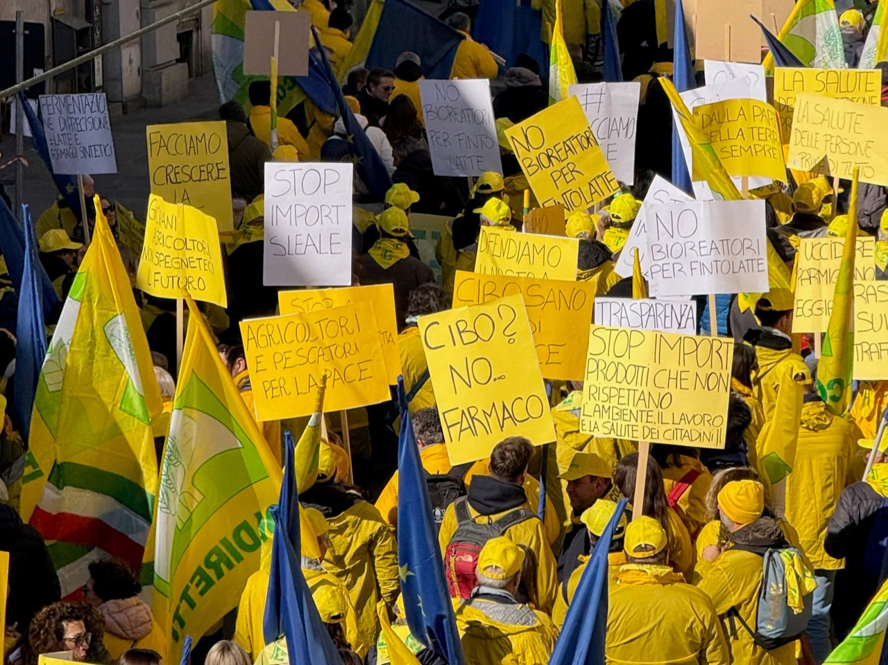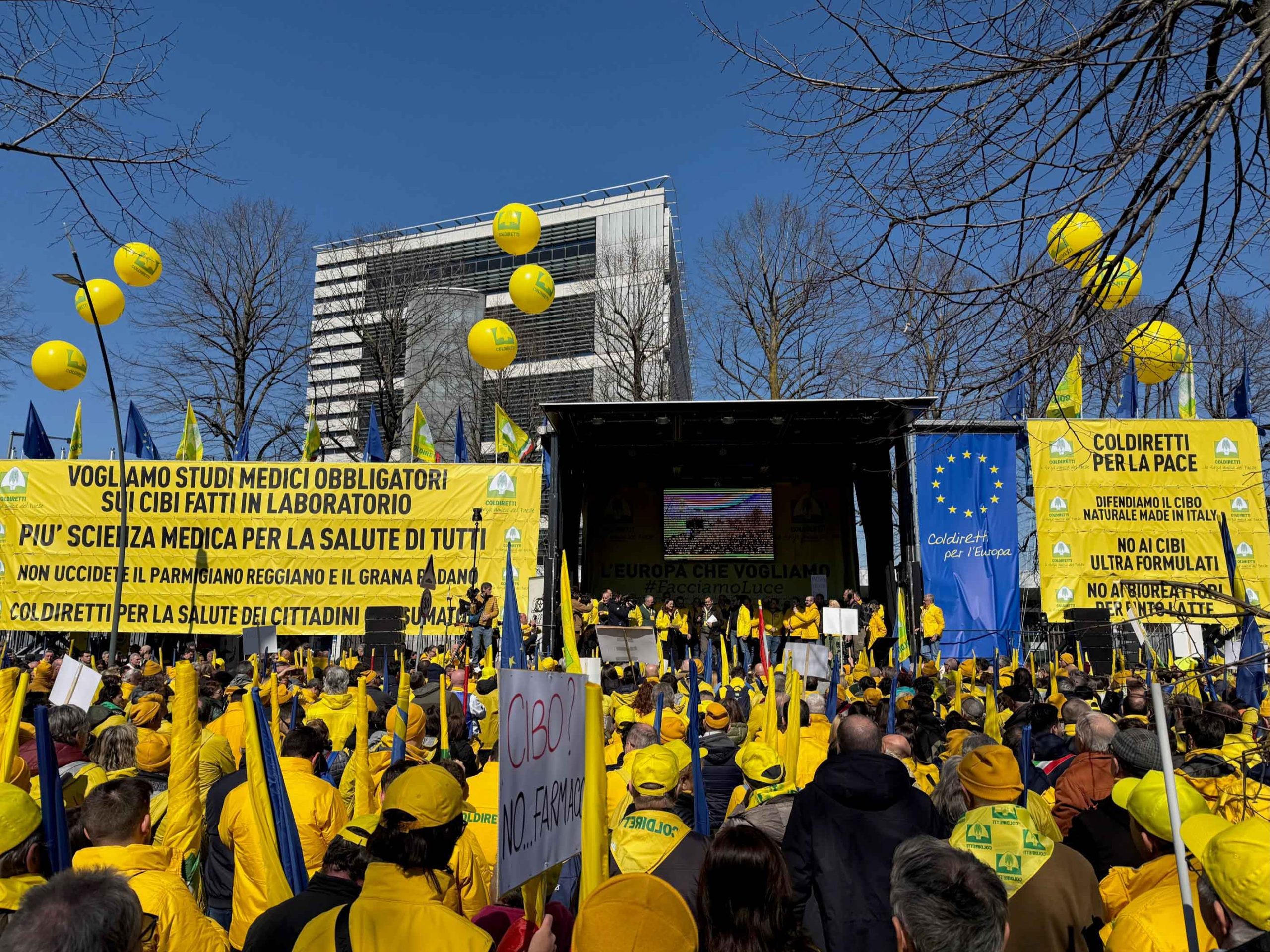 Le bandiere gialle dell’Organizzazione, con il tricolore italiano, hanno sventolato insieme a quelle blu dell’Unione europea a sottolineare il sostegno all’Europa, ma con la richiesta forte di un’Europa diversa, a cui oggi Coldiretti ha chiesto più coraggio. “Cibo dalle campagne non dai laboratori”, “Più ricerca medica”, “I cittadini europei non sono cavie”, ma anche “Coltiviamo un futuro di pace”, “Stop alle guerre militari e commerciali” e “L’Europa ci serve come il pane”: questi gli slogan su centinaia di cartelli presenti.